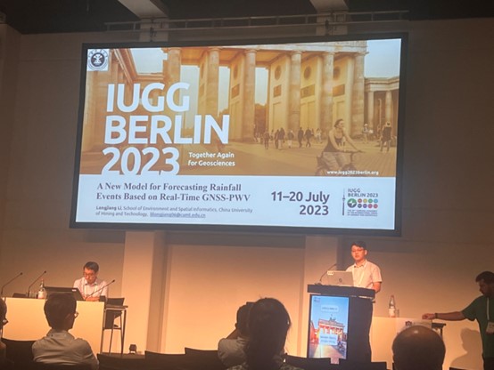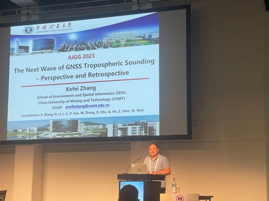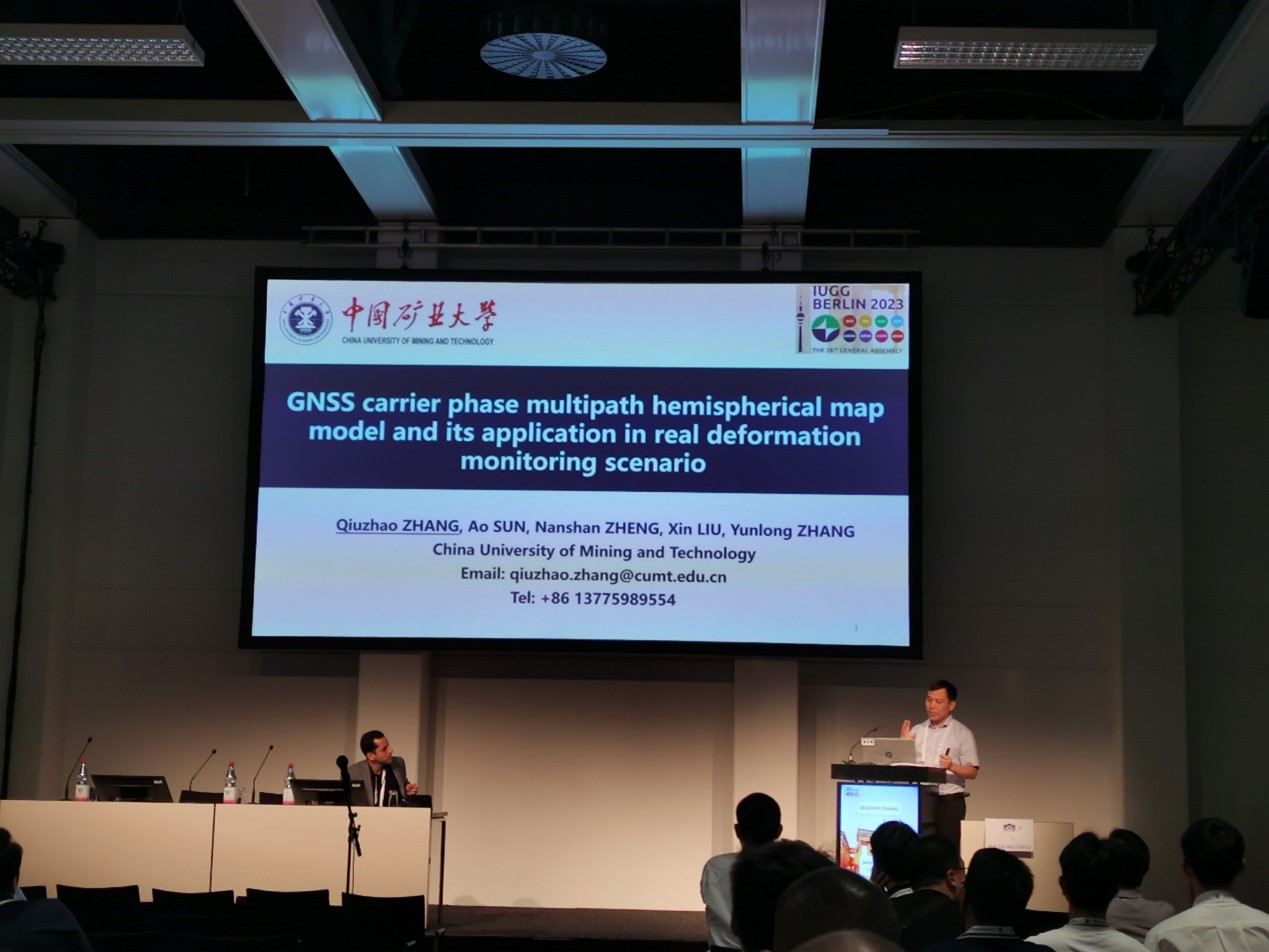 在空间资源勘探利用和GNSS对流层探测等领域的前沿研究成果,引发了与会代表的高度关注和广泛讨论。此外,张秋昭教授、尹智博士后、李龙江博士后和潘诚博士分别在IAG分会场上做了题为《GNSS dual-frequency carrier phase multipath MHM model and its application in real deformation monitoring scenario》、《The geometrical features of a gravitational plumb line using the potential flow theory – a revisit》、《A new model for forecasting rainfall events based on real-time GNSS-PWV》、《VIO-PPP: visual-inertial-odometry-aided multi-GNSS PPP navigation and positioning system based on factor graph optimization》的口头报告,并与相关学者进行了广泛讨论。李龙江博士后还得到了IUGG大会的资助。