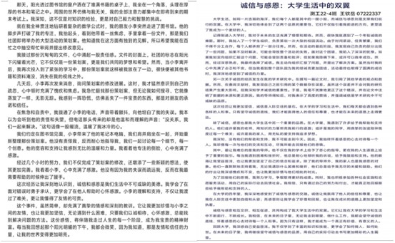 本次活动共分为征文与视频征集两个环节。其中在征文环节,同学们纷纷围绕“诚信感恩”这一主题,结合自己的生活经历和所见所闻,撰写了感人至深、富有深意的文章。这些文章不仅体现了学生们对诚信和感恩的深刻理解,也展现了他们积极向上、勇于探索的精神风貌。在视频征集环节,同学们用镜头记录下了身边的诚信、感恩故事,通过视频的形式传达了对诚信、感恩的理解和感悟。学生们的内容丰富、形式多样,既有对传统美德的传承和弘扬,也有对现代社会中诚信、感恩价值的思考和探讨。