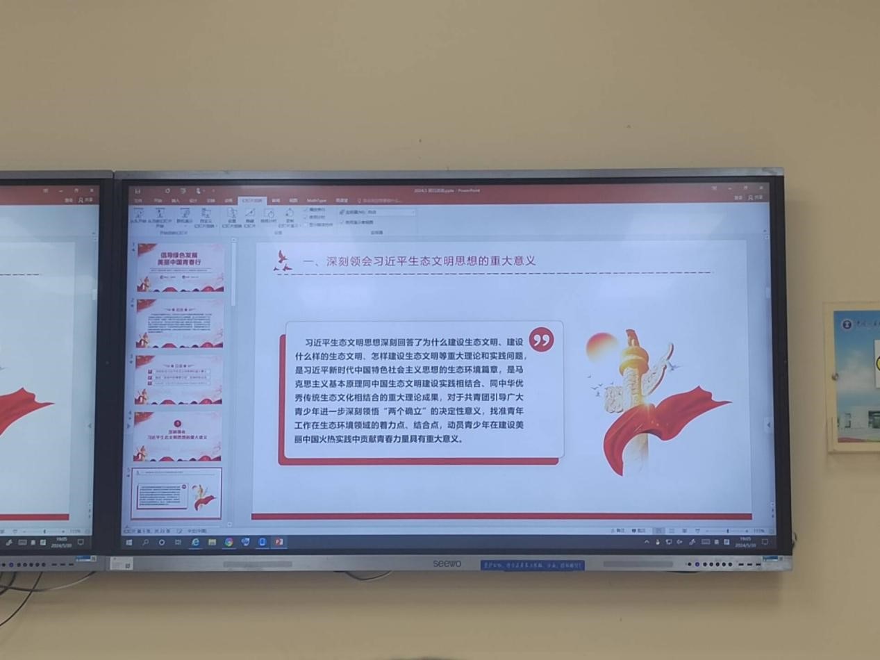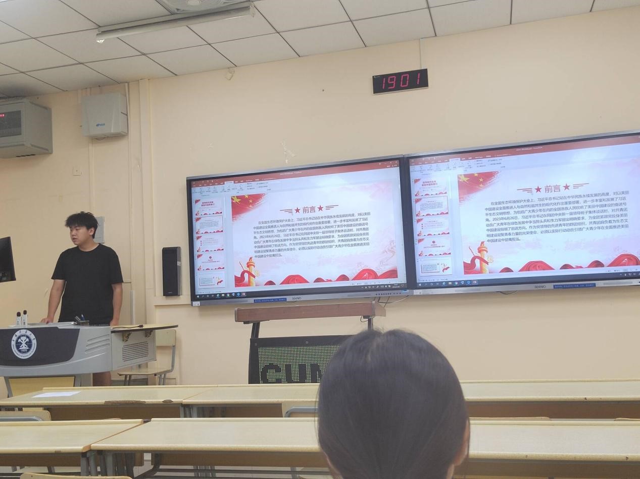 活动伊始,测工4班王钦岳同学简要介绍了本次团日活动的主题,全国生态环境保护大会上,习近平总书记强调了人与自然和谐共生的重要性,青少年也应积极参与到生态文明建设工作中。本次活动分为三个环节。第一个环节是深刻领悟生态文明思想的重要意义。王钦岳同学首先播放了河北美丽乡村建设的实例,从而引出建设生态文明的目的以及保护生态的具体措施。第二个环节是通过视频展现我国山、水、林、田、湖、草、沙的治理成果。最后一个环节是提出倡议,他鼓励大家作为广大新时代青年,应贯彻落实习近平总书记提出的绿水青山就是金山银山思想,投身到建设美丽中国的行动去。至此,活动圆满结束。