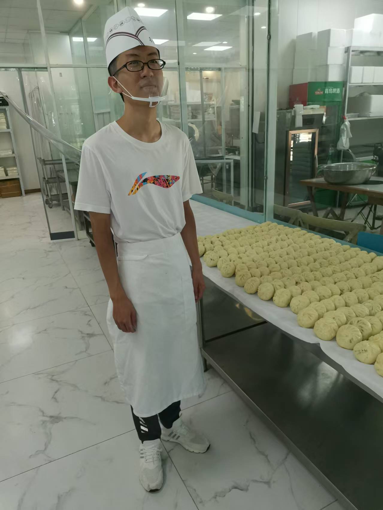 在活动的第一天,第一天,刘一夫同学参观了面点房,面点师傅现场演示特定产品的制作过程。师傅同时介绍了一些学习传统手工制作技术,比如手工面条、传统面点等的制作流程。并让参加者进行了试手。进入冷加工间,负责人组织观看了面点的冷冻、干燥、包装等技巧与凉菜的杀菌、处理等,也着重强调食品加工安全知识与生产环境的卫生保障。之后几天,刘一夫同学按照被分配的职责:面点师,开始了面点的批量制作,从揉面开始,到发酵,醒面,称重,塑形,烘焙,放凉,完成一批又一批的面点加工制作,然后对完成的产品进行分类,包装等一次处理,然后送入冷加工间,合格率达到99%。