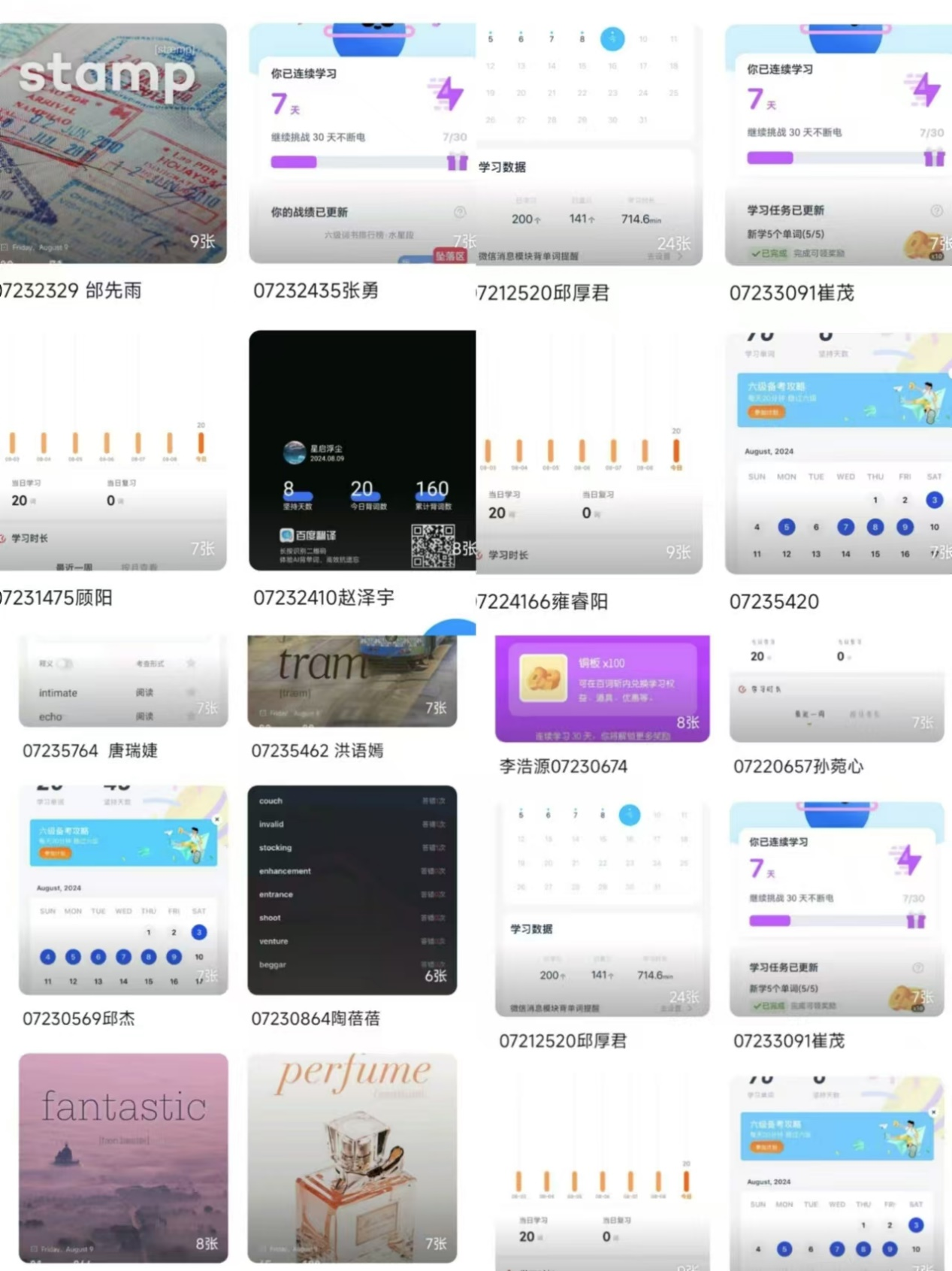 活动前期,同学们通过学院公众号推文等途径进入活动群并成功报名。8月3日至8月9日为活动的核心阶段,学生们每天在微信群内进行单词打卡,分享自己的学习成果。活动鼓励学生坚持每日学习,通过不断的积累,逐步扩大自己的词汇量。活动结束后,相关人员对所有参与者的打卡情况进行详细统计,并进行结果的公示。