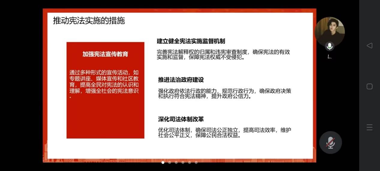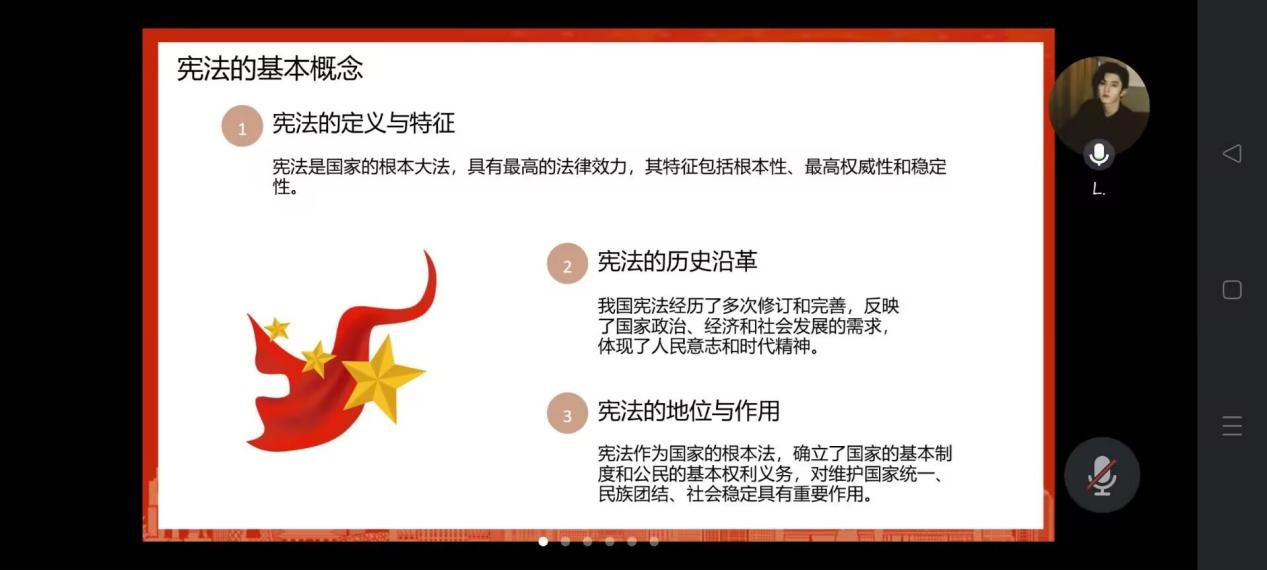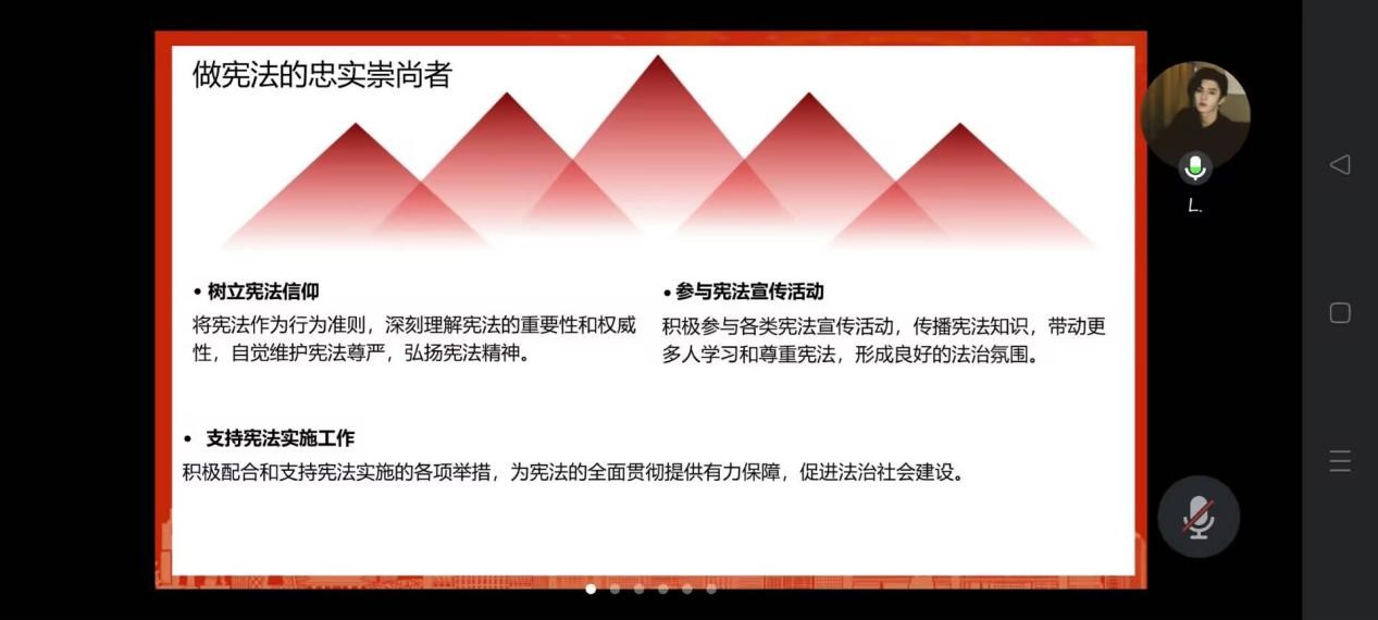 本次活动由宣传委员杨佳乐主持,她首先对法治思想的基本内涵及理论渊源进行了概述,强调了全面依法治国的重要性。随后向同学们普及了宪法知识。此外,她教导同学们要积极推动宪法实施,做宪法的忠实崇尚者、自觉遵守者、坚定捍卫者,为中国特色社会主义法治建设注入力量。活动最后,她又着重强调了一遍,作为青年大学生,要弘扬宪法精神,坚定制度自信。