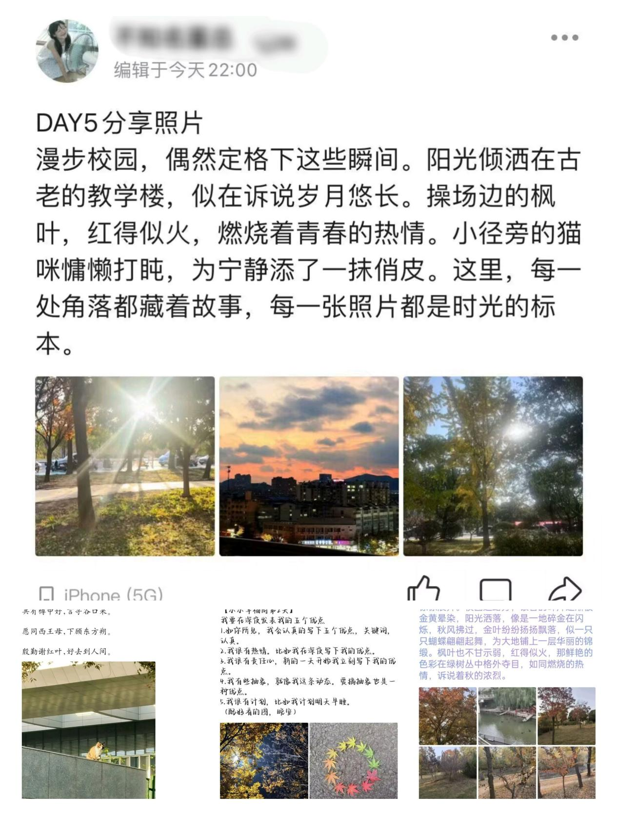 在活动期间,共有500多名同学们积极参与,每天都认真完成与小小幸福周内容对应的小事,并通过拍照记录下来。同学们开启一段特别旅程:写下几句钟爱的语句,在文字海洋探寻幸福踪迹;梳理自身 5 个优点,踏上自我发现与肯定的奇妙征程;拿起相机拍摄校园秋冬景色,用镜头捕捉校园独特美丽;精心整理书桌,感受整理过程中秩序带来的愉悦;与大家分享拍摄的照片。