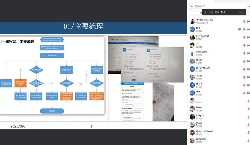 交流会分两场开展,2021级辅导员主持,分别邀请了测绘大类、环境大类2024届考研优秀学子进行分享,主讲学生结合个人经验全面、详细介绍了考研复试与调剂工作流程、基本要点、备考方法、调剂择校思路及各个节点的注意事项。此次考研复试和调剂线上经验交流会,不仅为考研学子的复试提供了建议、指明了方向、鼓舞了士气,同时也有助于学生坚定信心、调整心态、科学合理地准备复试与调剂。