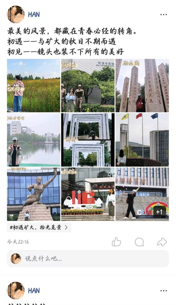 学生会体育部于2025年9月19日至9月28日举办“初遇矿大,拾光觅景”新生校园景点打卡活动。本次活动得到了全院新生的积极响应和热情参与。