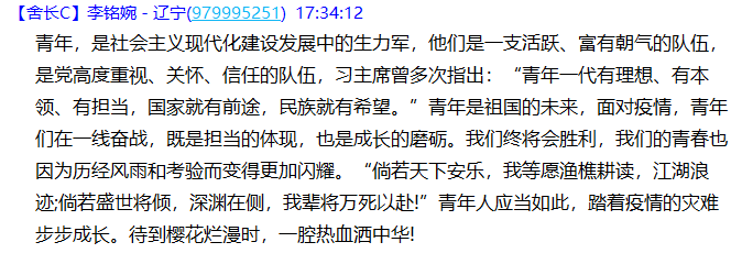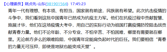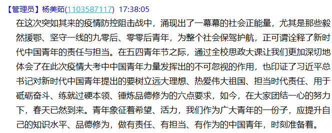 202054日下午四点,校党委书记刘波老师于线上开展全校思政大会,大会主题为“疫情大考·时代责任·青年担当”。会后,我班团支部针对这次思政大会,围绕“疫情大考,我所理解的时代青年”开展线上主题研讨会。
