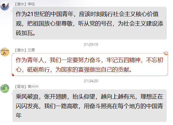 测绘16-5班线上组织同学进行了关于“五四青年”研讨学习会,研读五四相关材料并分享自己在五四青年节的感悟。
