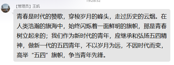 五四青年节学习材料》和《习近平总书记五四前后重要讲话全文》,并以寝室为单位进行深入地讨论。研读过后,同学们在班级群发表了自己的看法。同学们都表达了作为新时代新青年,自己应有担当,有理想,发扬五四精神,为自己,为社会,为国家付出一份自己的力量。有的同学结合了疫情期间的感想,表达了自己对于青年人的理想信念的看法,有的同学则表示青春因奋斗而更精彩,要为中华民族伟大复兴而努力奋斗,也有同学阐明了青年人与国家发展之间的联系,表示自己要为祖国多做贡献,还有同学用前辈英雄的精神来勉励自己……然后同学们再结合“五四接力”活动,在空间发布了关于五四青年节感想的说说。