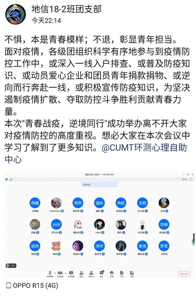 面对疫情,各级团组织科学有序地参与到疫情防控工作中,或深入一线入户排查、或普及防疫知识、或动员爱心企业和团员青年捐款捐物、或逆向而行奔赴一线,或宣传防疫知识,为坚决遏制疫情扩散、夺取防控斗争胜利贡献青春力量。地信18-2班响应号召,举办此次班会,加强防疫知识的宣传,此次班会在线上举行。