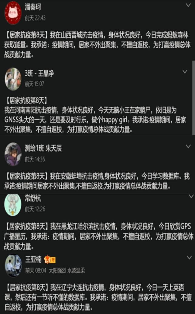 地信18-01班的同学们在家仍积极参与学校组织的疫情志愿活动,进行每日的线上打卡任务,为打赢疫情阻击战贡献力量。有的同学每日关注疫情动态,用心制作了疫情防控主题的PPT,还有的同学用文字表达了此次疫情必胜的决心。