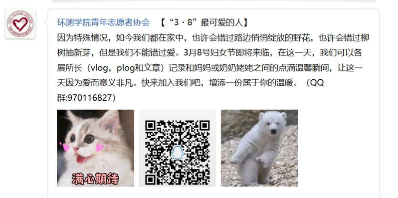 青年志愿者协会环保部在全院发起“3·8最可爱的人”志愿活动,吸引同学们关注和参与到本次活动当中。本次活动旨在在妇女节的节日氛围下,让大家多感受到自己和母亲或者姥姥奶奶之间的亲情并且记录下这一美好回忆。