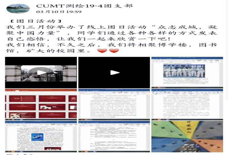 测绘类19-4班于2020年3月1至15日开展“众志成城,凝聚中国力量”主题团日活动,采用线上的方式进行。