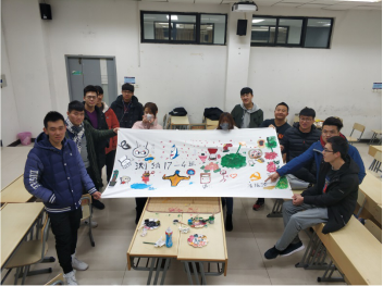 下午4点,4班的同学已于指定地点集合完毕。首先同学们都用铅笔在画布上勾勒出自己想画的轮廓,然后在指导同学陈柄帆的帮助下用颜料在班旗上进行上色,班长则全程在一旁为大家清洗画笔。经过同学们的合作,大家画出了鲨鱼、荷花与荷叶等等别具风格的图样。在最后一个绘画环节中,班长对没上色的图案进行上色并且与大家对班旗做了点缀,整个教室氛围热烈。最后大家和亲手制作的班旗拍了合照。
