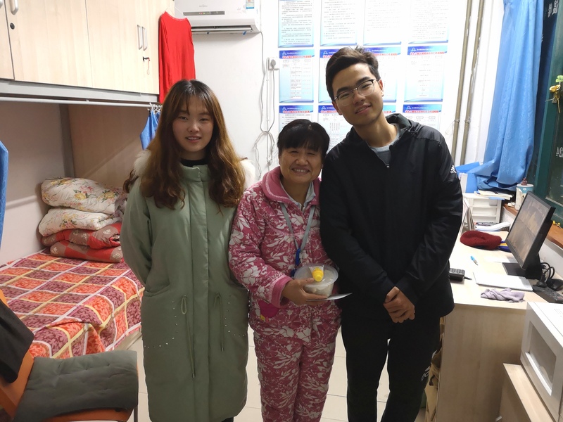 下午6时,同学们将事先准备了饺子和护手霜和明信片等小礼品送予桃一、桃五、松二和竹一的宿管阿姨们,随后同学们来到宿管阿姨值班室,虽然在周六宿管阿姨的工作更为繁忙,但她们没有表现出丝毫倦意,还对同学们的到来表示欢迎并面带微笑迎接同学们,同学们与宿管阿姨愉快的聊天,随后拿出饺子、护手霜和写有祝福语的明信片送给了阿姨,向她们为宿舍各方面事务的默默付出表达由衷感谢,感谢她们在宿舍安全,宿舍卫生和同学们日常生活方面的辛勤管理。
