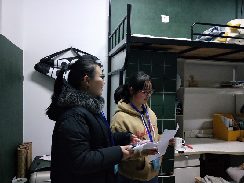学生会生活权益部工作人员执行,对已报名大一、大二学生宿舍装扮进行检查评分。