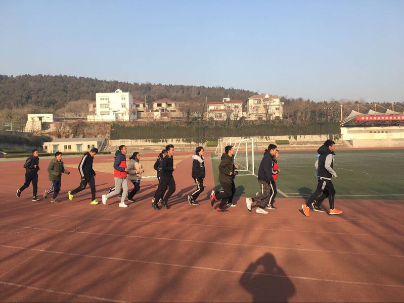 训练分为两阶段,第一阶段训练为热身。教练带领田径队队员进行了15分钟慢跑, 随后依次进行热身操、压韧带训练、踢腿、侧踢、小步跑、交叉步和正反向跑等一系列活动。热身结束后,队员们进行短暂的休息。接着训练进入第二阶段,教练按照计划表组织田径队成员依次进行50米折返跑、坐地起身以及两圈的变速跑、长距离车轮跑、短跑和长跑。田径队队员们在训练中十分投入,毫不懈怠,拼尽全力完成每一项训练任务。