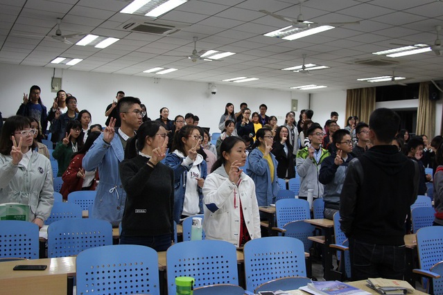 在课堂上,主持人首先对手语进行了详细的介绍,并向同学们播放了往年录制的“闪出光彩”手语快闪表演,同时指出了表演中存在的一些不足。之后,由青年志愿者协会的各位成员正式开始带领同学们进行手语的学习,同学们对此表现出了极大的热情,都积极地练习各种手语动作。