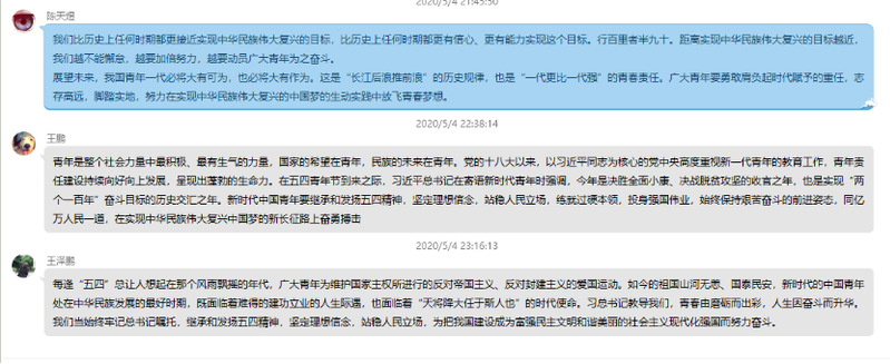 通过这次的思政课以及课后的线上讨论,班级同学都对自己身为当代青年所担负的责任有了新的认识,今后也会更加积极努力地学习和生活,不负韶华。