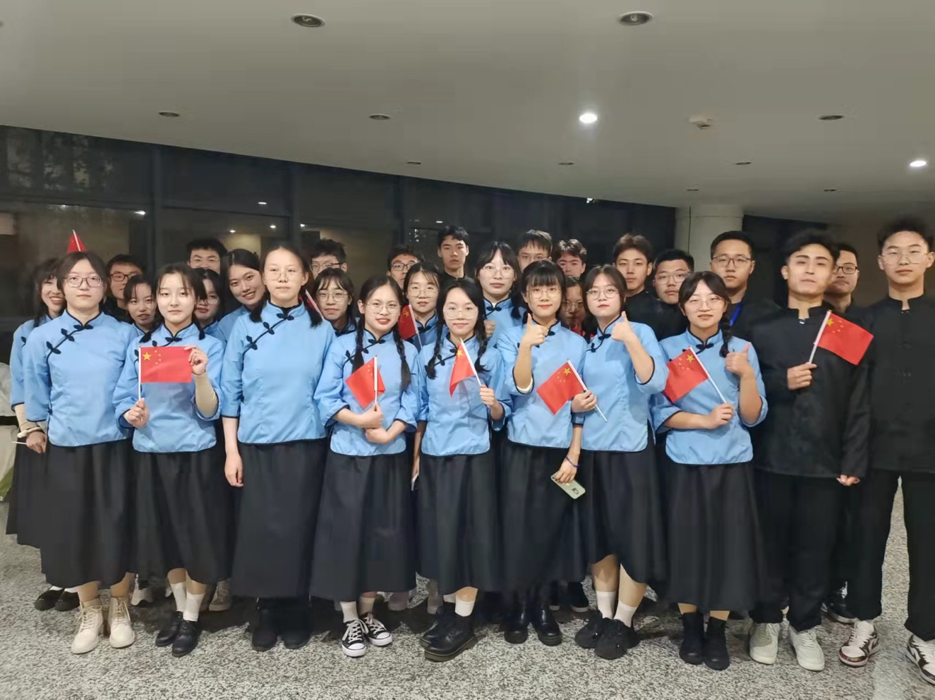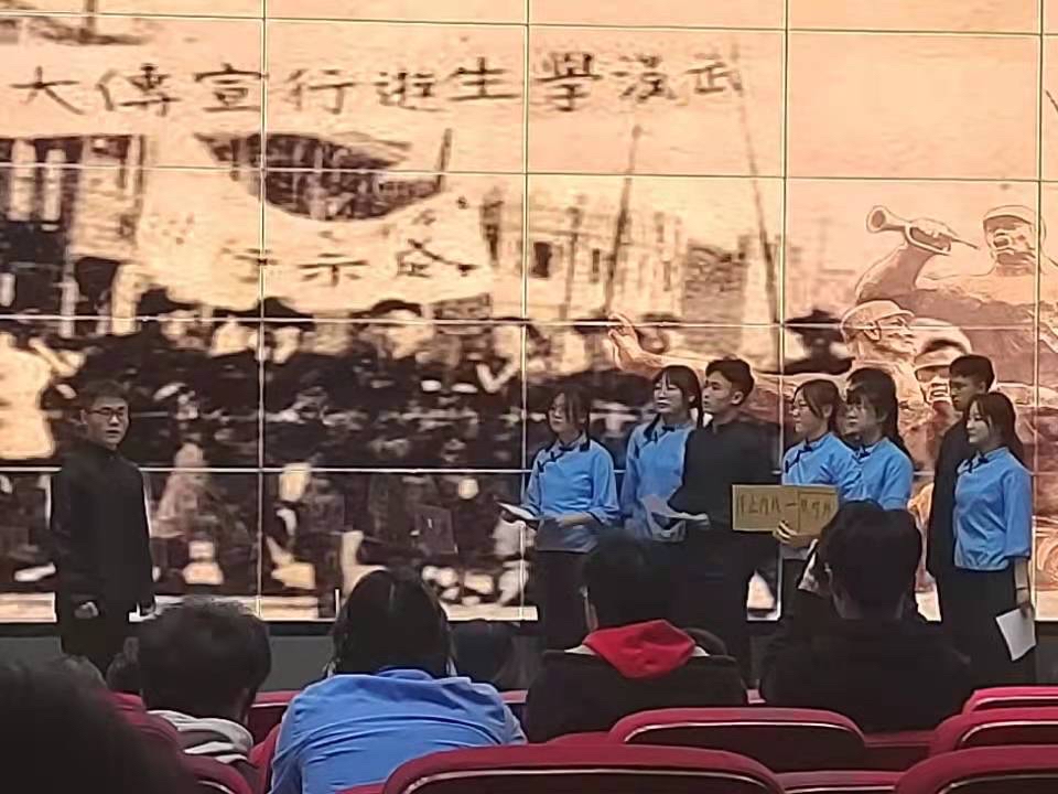活动开始,首先由文艺委员以视频和PPT相结合的形式向观众分别介绍了班级学风建设。在节目展示环节中,环境类21-3班全体同学通过出演话剧《一二九运动》再现当时场景,充分体现了当代大学生的精神风貌和爱国情怀。表演最后,全体同学身着抗战年代时期的衣服,表演了手语操《国家》,手持红旗喊出了“我爱你中国”的肺腑之言,并获得了评委的一致好评和观众们的掌声,活动最后,环境类21-3班获得了二等奖的好成绩。