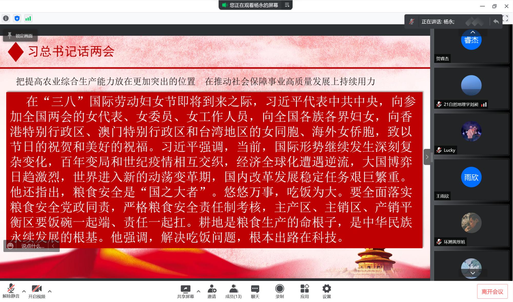 3月29日19时,我院研究生会举行了线上两会特辑理论学习,研究生会共14名同学参加了本次线上活动。本次学习内容主要分为政府工作报告、“习近平总书记话两会”和与两会相关的时政热评三个部分。
