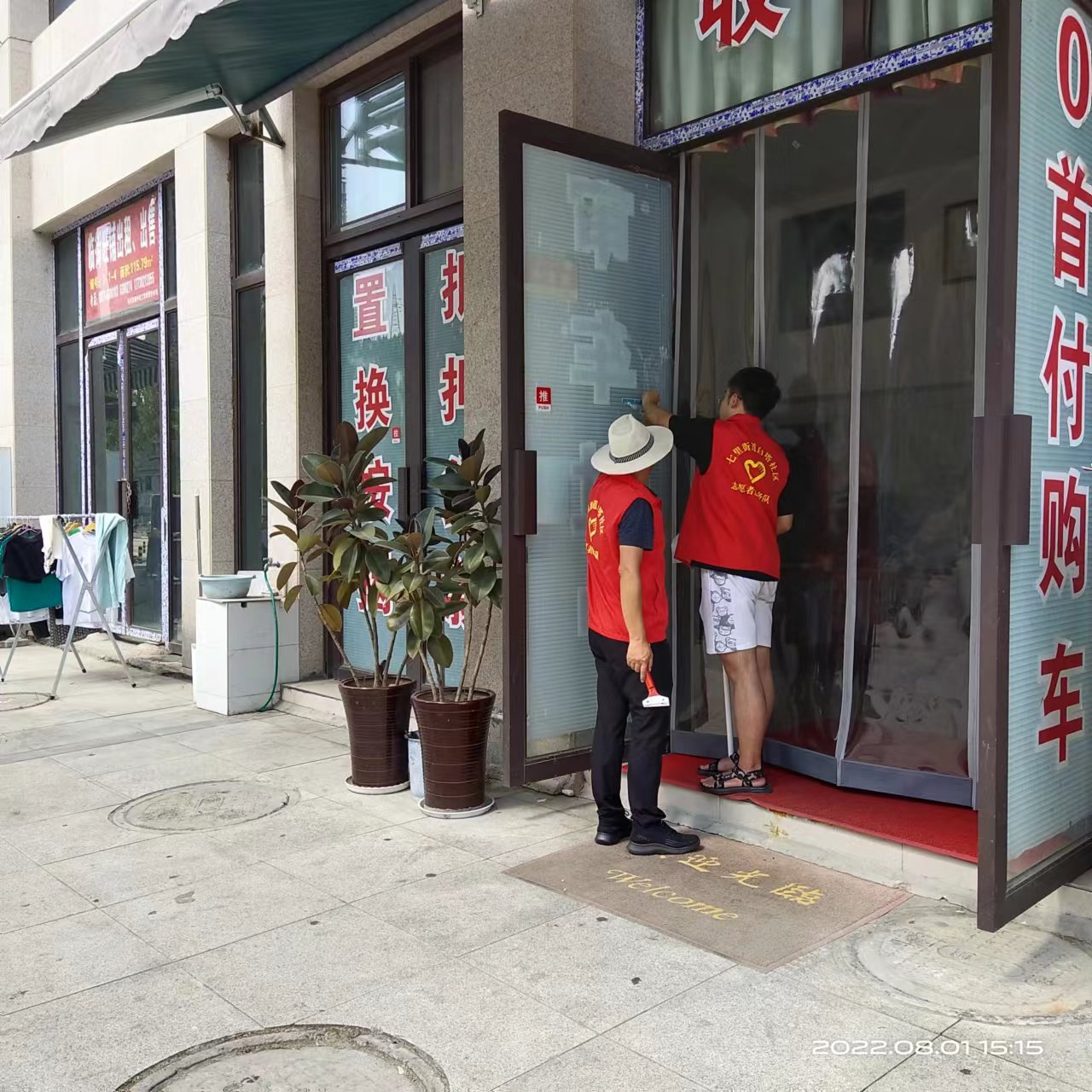 8月1日14时30分,社区组织三位志愿者为一组,沿七里大道两旁逐个门面进行废弃广告清理,高浩然同学所在小组自巴都大道与七里大道交汇口开始清扫,小组三位成员中两人负责清理广告,一人负责拍照,工作轮换进行。工作开始时,因缺少与商户的沟通,工作开展并不顺利。鉴于此类情况,高浩然同学主动要求在下一户的门面清理之前与商户进行仔细的解释说明,之后的清理工作变得顺利了许多。