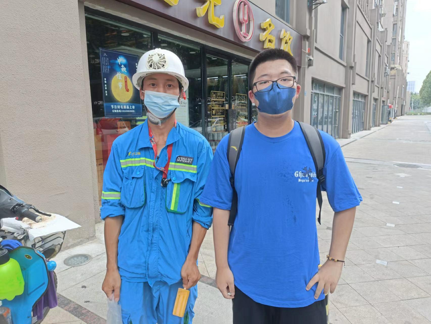学子潘辰睿于8月5日同江苏省南京市江宁区晓里社区的志愿者们为当地环卫工人赠送礼物,表示感谢。