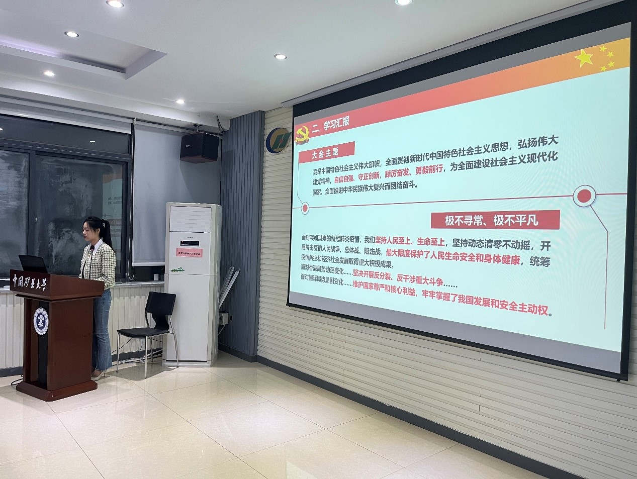 本次党日活动立意高远、催人奋进。活动伊始,主讲人孙洁雅同志带领大家回顾了中国共产党的百年历史,详细介绍了党的二十大的具体内容;随后,博士第二党支部书记李泽同志阐述了党的二十大在环境方面作出的科学指引,让生态文明理念深入人心;博士第三党支部书记吴淑慧同志带领大家深入学习贯彻党的二十大精神并领会习近平总书记重要讲话精神;硕士地信遥感联合党支部书记刘金霖同志在此次大会中感受最深的是“人民”两字,人民群众是立党兴党强党之本。