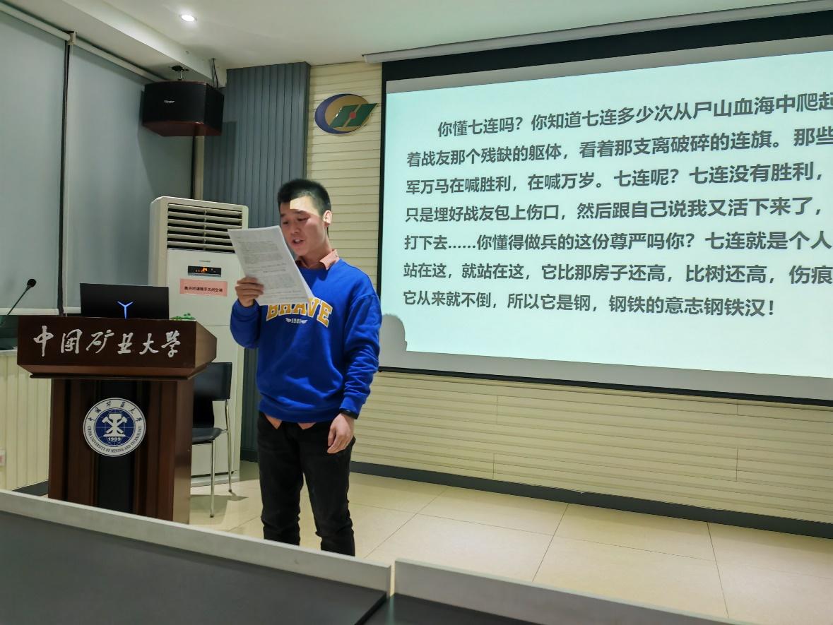 活动下半场,刘秉锋同志带领同学们回顾抗美援朝战争的艰难过程。这一场战役为我国从站起来到强起来奠定了坚实基础,提高了新中国的国际地位。其次,林自强同志朗诵了《士兵突击》第十五集台词节选,让同学们感受到了士兵钢铁般的意志。接着,刘秉锋同志为同学们介绍了现如今我国的战备,并强调经济发展才是强军的重要条件,我国的科学家们也为实现强军目标付出了巨大的努力。最后,孙洁雅同学朗诵了《感动中国》给钱学森的颁奖词。