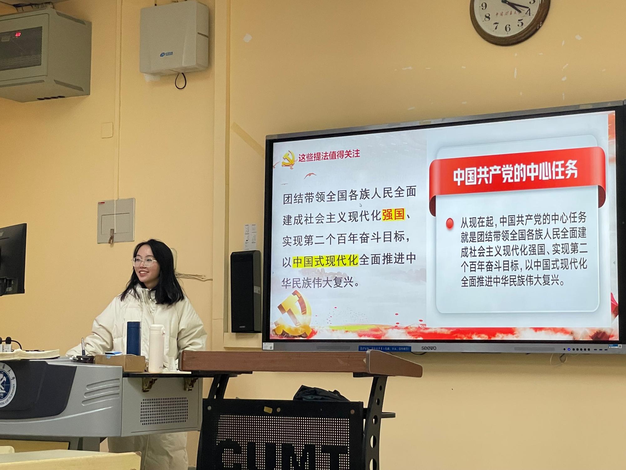 活动伊始,团支书陶梦柠带领同学们简要学习了党的二十大报告,牢记党的二十大相关精神。一条条令人印象深刻的新提法,让大家一睹了党领导中华民族取得的一系列新成就,同时也深刻认识到我们党在下一阶段的中心任务和奋斗目标,激励着大家自信自强、守正创新、踔厉奋发、勇毅前行。