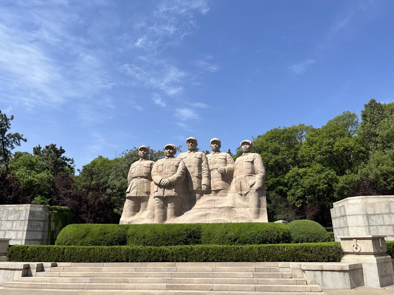 活动伊始,活动策划人林伟民同志带领大家参观了国防园,这里陈列着淮海战役的63式水陆两栖坦克、歼5、6以及破击炮等退役武器。紧接着,同学们参观了淮海战役总前委群雕,淮海战役总前委是淮海战役前线最高指挥机构,由刘伯承、陈毅、邓小平、粟裕、谭震林五位同志组成。整个群雕气势非凡,形象逼真。接下来,同学们参观了淮海战役烈士纪念塔并拍了集体合照。淮海战役烈士纪念塔塔身正面镶嵌着毛泽东题写的“淮海战役烈士纪念塔”九个镏金大字,塔基左右各为解放军和人民支前的浮雕,塔四周的围廊刻有刘少奇、江泽民等领导人的题词和3万余名烈士的名录,镶嵌着反映淮海战役的大型陶瓷壁画。