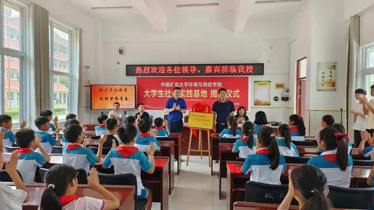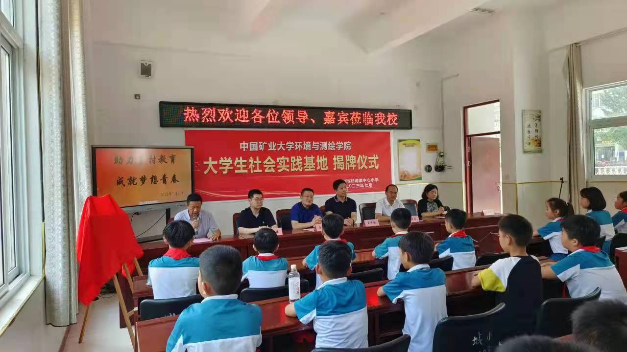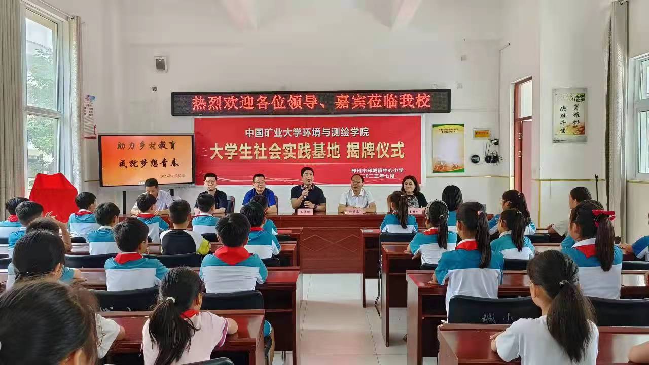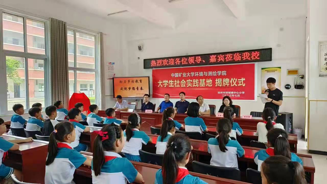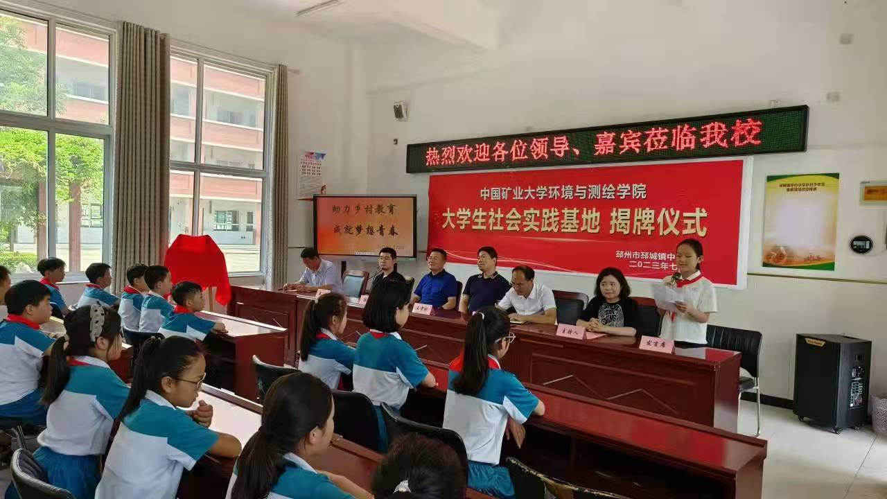此次揭牌仪式由邳城镇中心小学副校长刘敏主持。活动伊始,刘校长向到来的领导和志愿者们表达了欢迎与感谢。紧接着汤相普局长致辞欢迎,高度赞扬了矿大师生们的奉献精神。随后,王守刚书记讲话,介绍了矿大的历史,希望中心小学有更多的学生在未来能够相聚矿大。之后,惠祥东校长致辞,讲述了中心小学的发展历史并对学校的未来提出展望,期待支教团与学生们能有一段美好经历。然后是支教团代表惠智杰同学发言,表达了自己的教育梦想。邳城镇中心小学学生代表卢润青表示要通过努力学习,争做一名优秀的学生。最后,汤相普局长与王守刚书记为大学生社会实践基地揭牌。