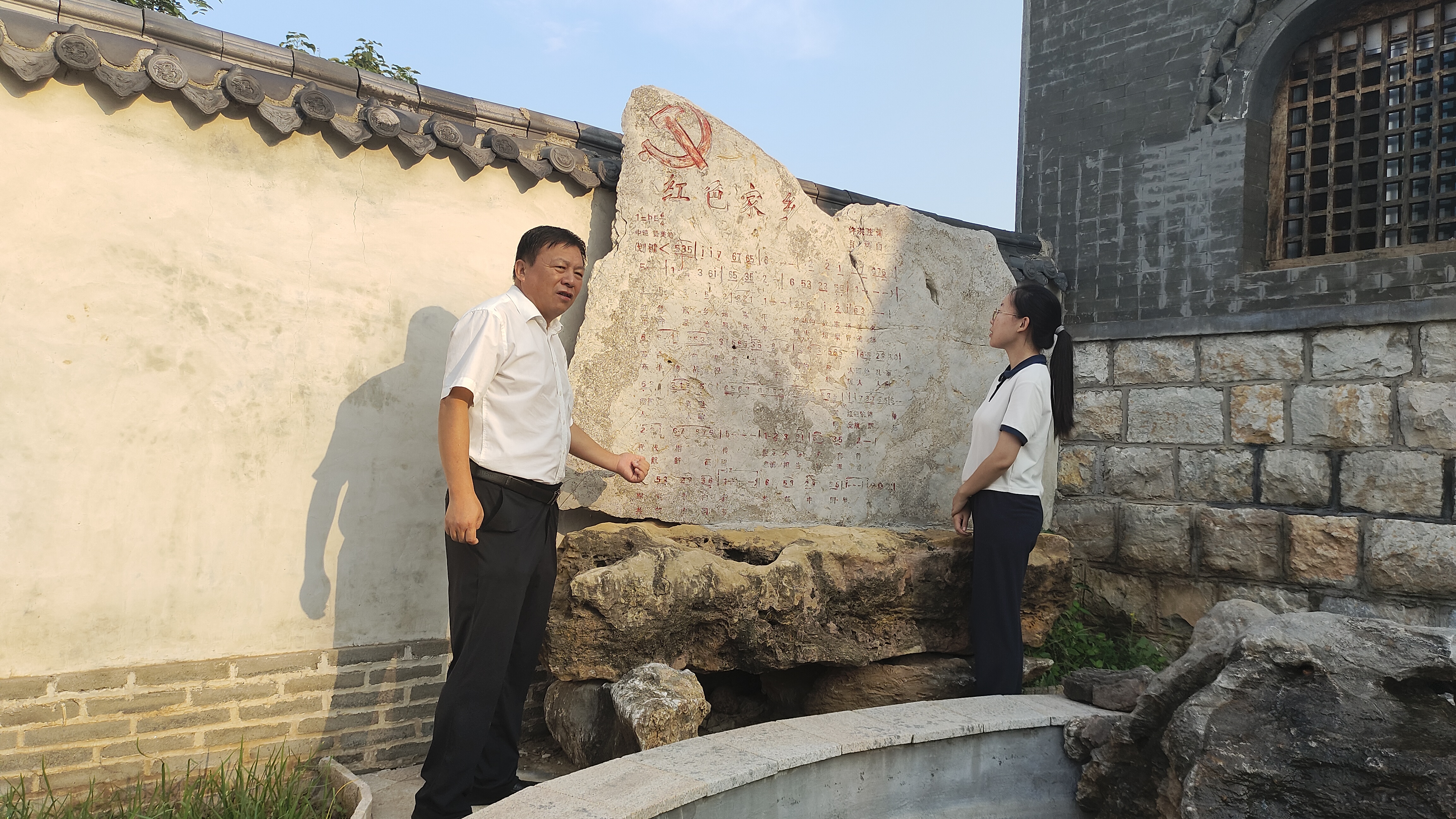 走进龙泉博物馆,实践人员沿着抗战遗址,瞻仰抗日战争时期的历史文物,重温东平革命的峥嵘岁月。在馆长的讲解和引领下,实践人员参观了红色记忆馆展厅,厅中大量的实物、文字和图片史料,记载着清泉山的抗战光荣历史。一件件珍贵的革命历史遗物,一幅幅逼真的画面,一幕幕感人的战斗场景,深深感染了参观者。随后,实践人员注意到博物馆内立有石碑,上刻馆长亲自作词的红色歌曲,遂积极发问。馆长热情讲述了歌曲寓意,并回忆其恢复建设清泉山抗战旧址的艰难历程,让实践人员体悟到宣传红色文化与传承红色基因的重大意义,坚定永远跟党走、共筑中国梦的信心决心。