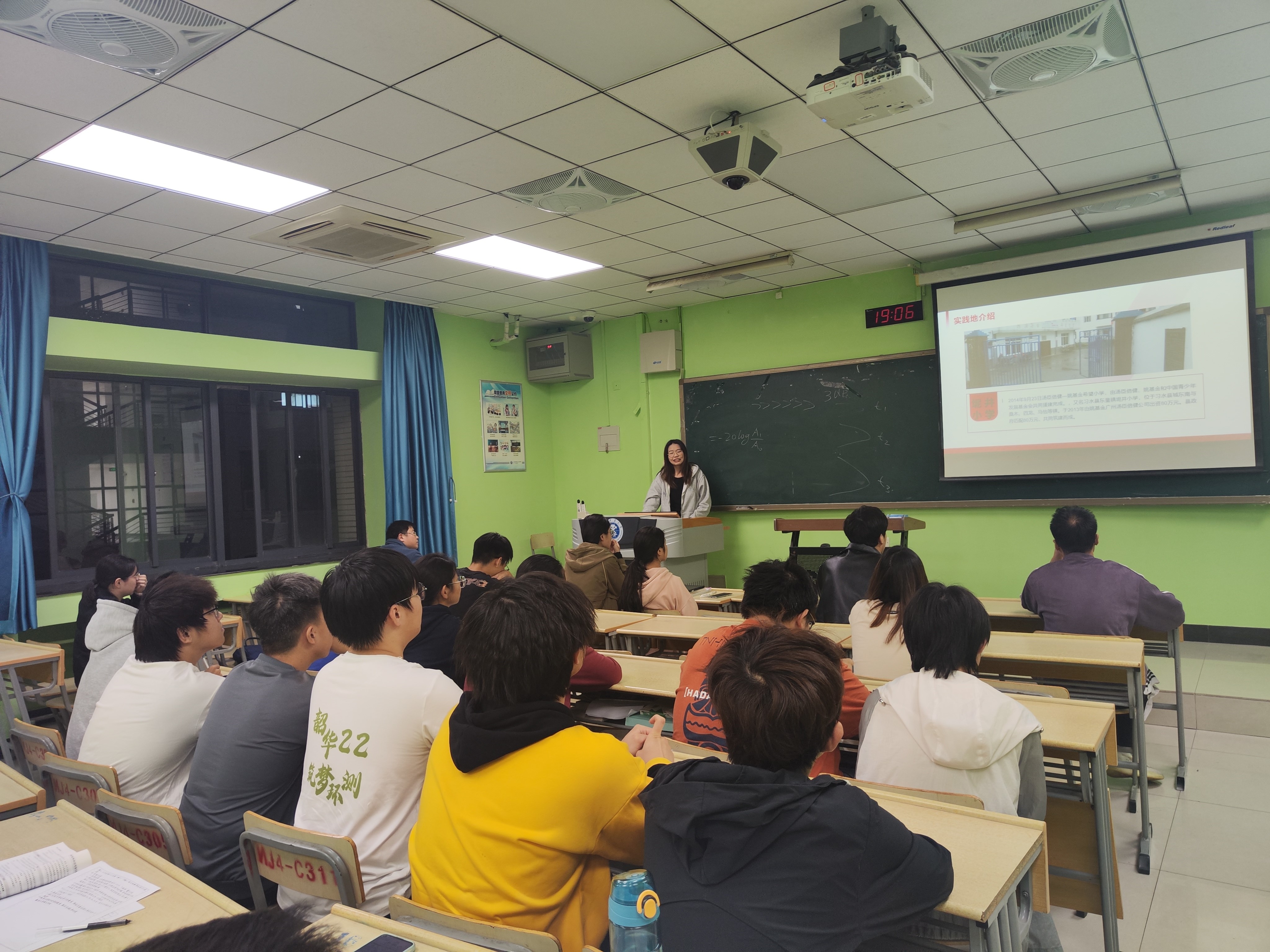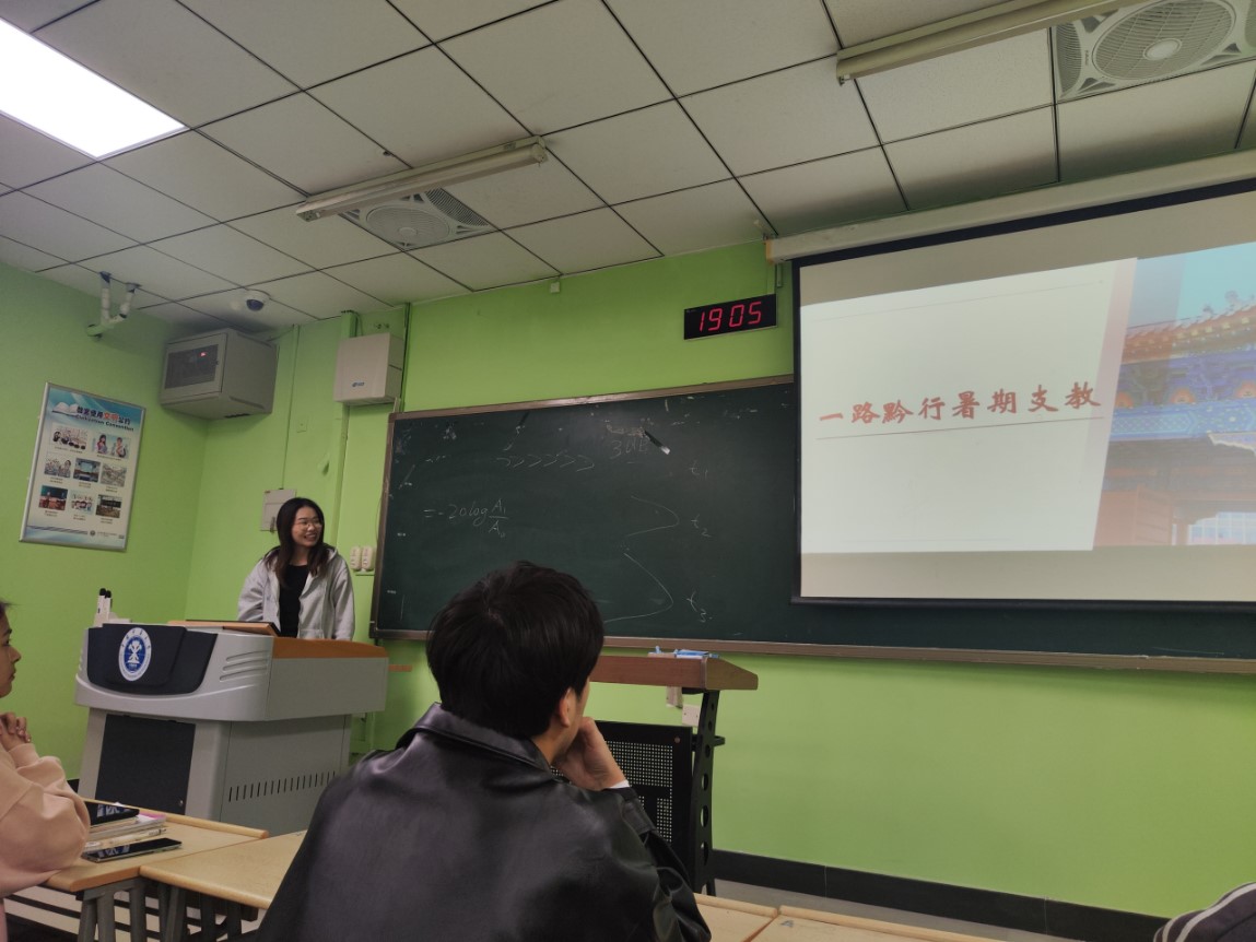 本次团日活动主要由马鑫俞同学为同学们分享了她暑假参加“一路黔行”支教团在贵州习水县支教的经历。马鑫俞同学从实践背景、实践内容、实践经过和实践的成果及展示四个方面向同学们展示了她此次社会实践的全过程,虽然舟车劳顿,条件艰苦,但从中更能感受到的是服务社会以及为孩子们传授知识带来的快乐,同学们都聚精会神听她分享支教过程中发生的趣事。通过她的讲解,同学们更加深刻地领会到了社会实践对于当代大学生的意义。