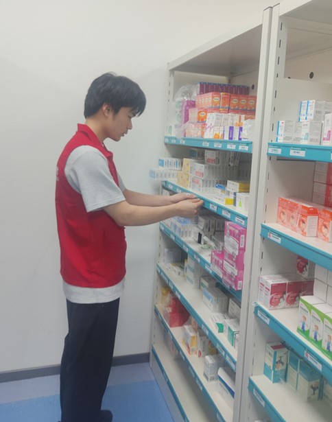 在随后的志愿服务中,尹思源也协同帮助医院工作人员完成了力所能及的事项。在药房中,尹思源辅助医生将药房药品的名称打印下来,并通过过塑机过塑,再进行裁切,制作成药品的标签。随后一同整理药房药品,并重新更换药品的标签。