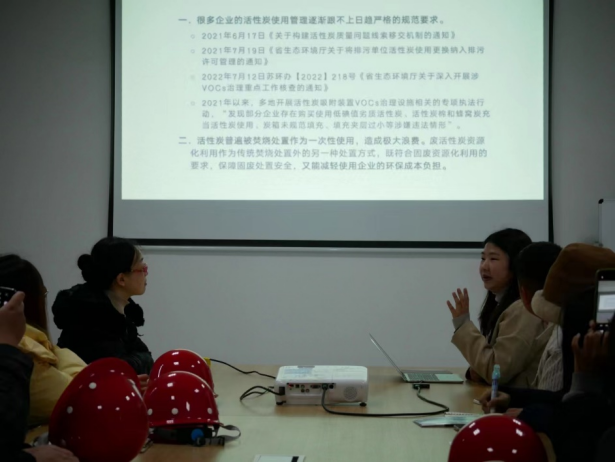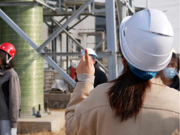 该公司成立于2019年12月,项目占地面积约37亩,主要经营饱和活性炭的回收处置及再生利用,以降低企业运营成本。项目设计处置能力为2万吨/年,分两期建设,采用“热解-脱硝-喷淋”的工艺流程。为彻底解决活性炭更换不及时的问题,公司还开发了在线活性炭“码上换”监管平台。通过实习,同学们掌握了活性炭热解再生原理,了解了活性炭资源化再生途径,并对活性炭性能指标有了明确的认识。