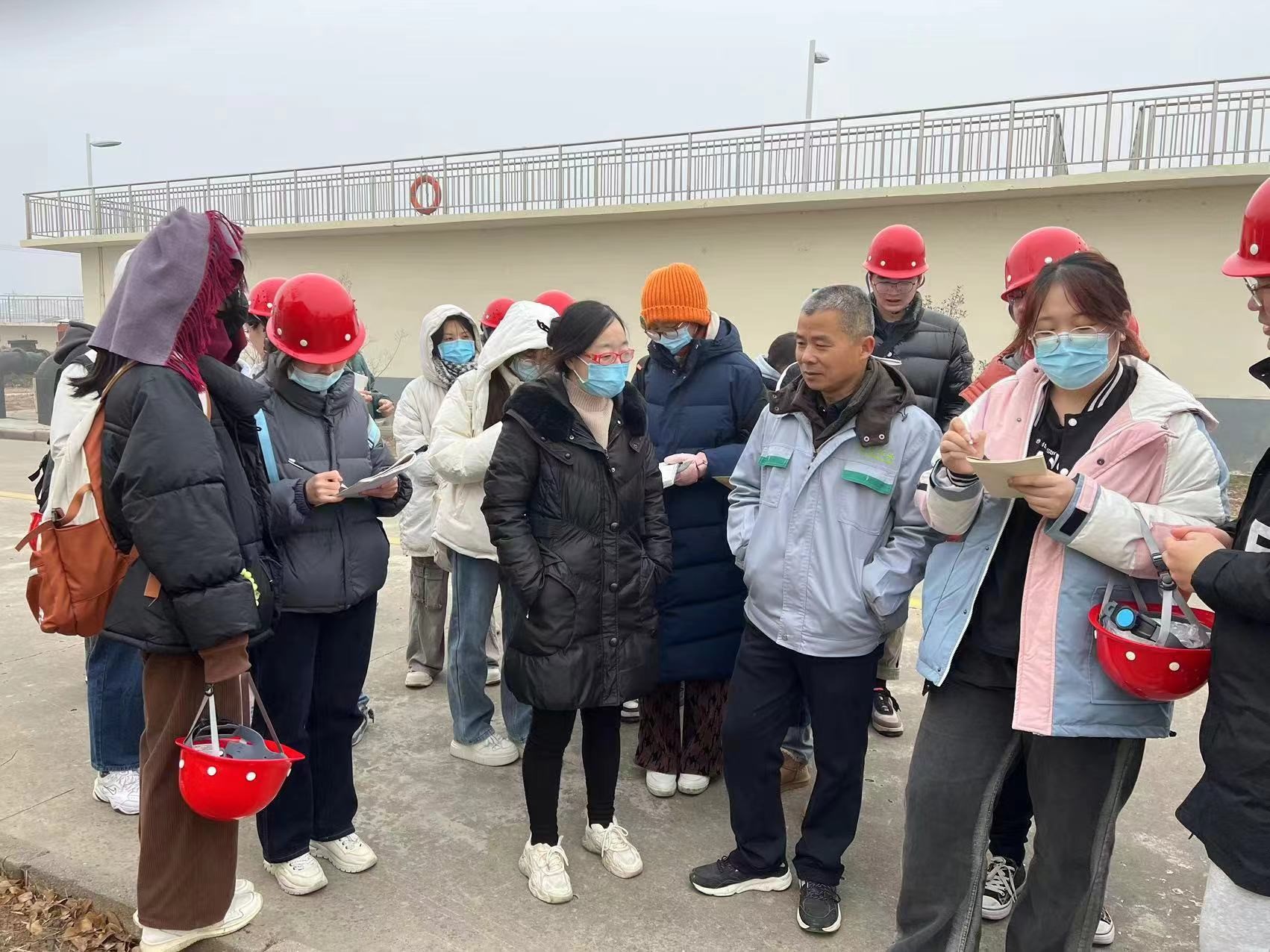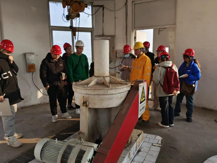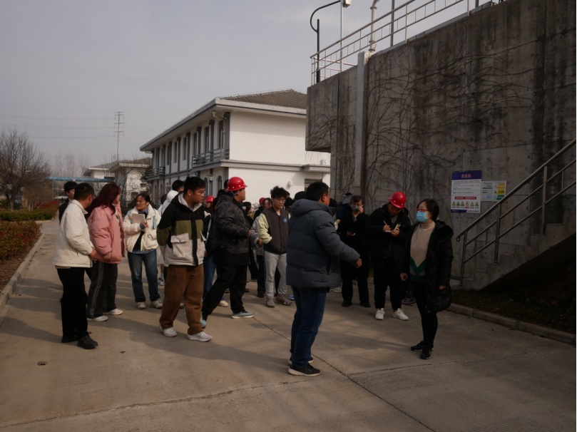 实习团队首先来到沛县杨屯园区污水处理厂,该厂为江苏省沛县沛北经济开发区污水的前处理厂,主要承接高氟废水。废水经过三级除氟工艺,氟含量可从原来的220mg/L降至1.5mg/L以内,成效显著。周院长还启发同学们,将课本知识与实际生产相结合,并带领大家回顾了化学沉淀法、絮凝沉淀法等含氟废水处理方法。