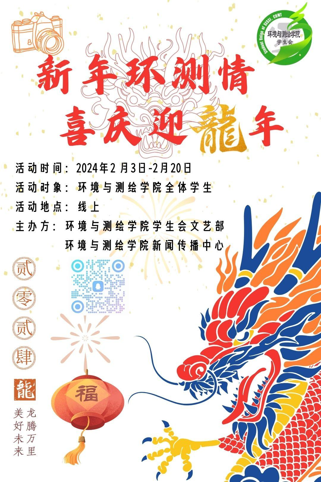 学生会文艺部主办的以“新年环测情,喜庆迎龙年”为主题的新春活动顺利开展。活动以加强学生对传统文化的认知,了解学校的内涵精神为目的,让参与的同学可以参加校歌合唱,或者录制新年祝福视频,以此抒发对新年的期待和对矿大的思念。本次活动通过线上报名,线上收集作品的形式进行,由小宝寻花