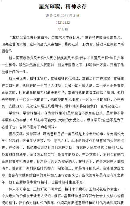 本次活动采取线上报名、提交作品的形式进行。同学们以弘扬雷锋精神和“奉献、友爱、互助、进步”的志愿精神为主题进行写作,并通过此次征文活动传承红色基因,在春天的校园内将雷锋精神这颗种子根植于心、传递温暖。