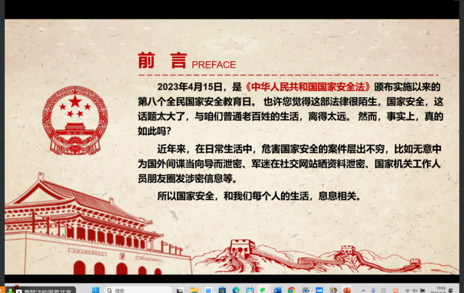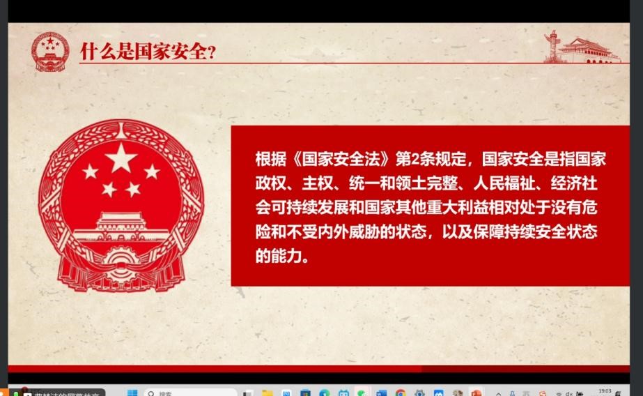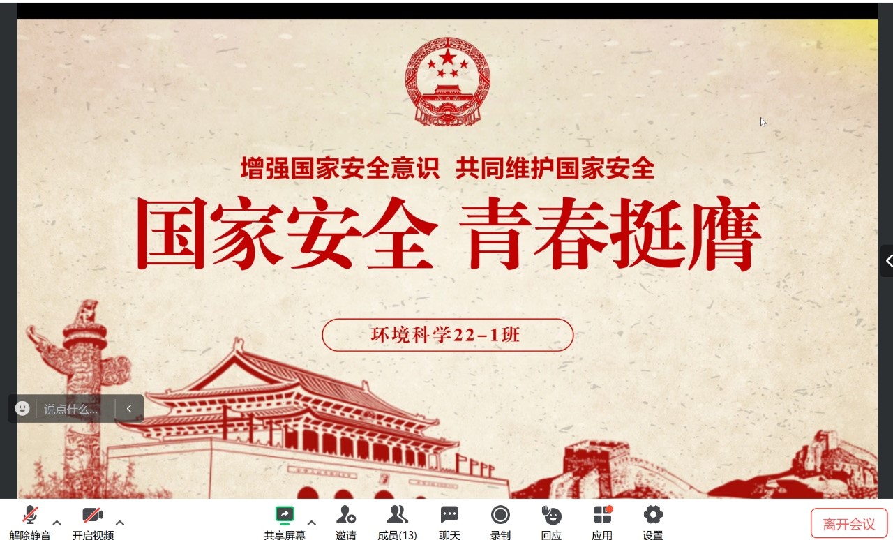 2024年是习近平总书记创造性提出总体国家安全观10周年,4月15日将迎来第9个成立国家安全教育日。共青团中央国家安全联合开展国家安全青春体验主题党日活动周,共同学习总体国家安全观,因此环境科学22-1团支部于2024年5月9日线上开展“国家安全,青春挺膺”团日活动。