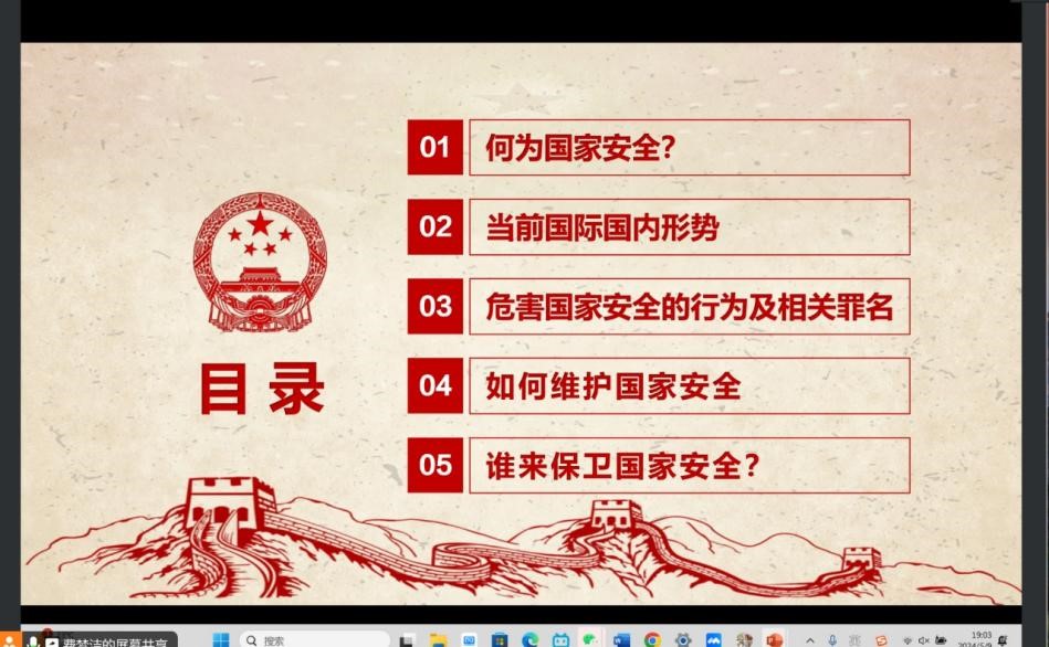 本次会议由团支书费梦洁主持开展,宣传委员吴美禛进行记录。本次会议的主要内容由“何为国家安全?”、“当前国际国内形势”、“危害国家安全的行为及相关罪名”、“如何维护国家安全”、“谁来保卫国家安全?”五个内容组成。主持人从介绍国家安全入手,到从当前局势出发分析维护国家安全的必要性,接着对国家安全的内容进行解析,最后落实到如何维护国家安全上,中间穿插多组案例,通过“李某”“王某”等反面例子告诫全体团支部成员。