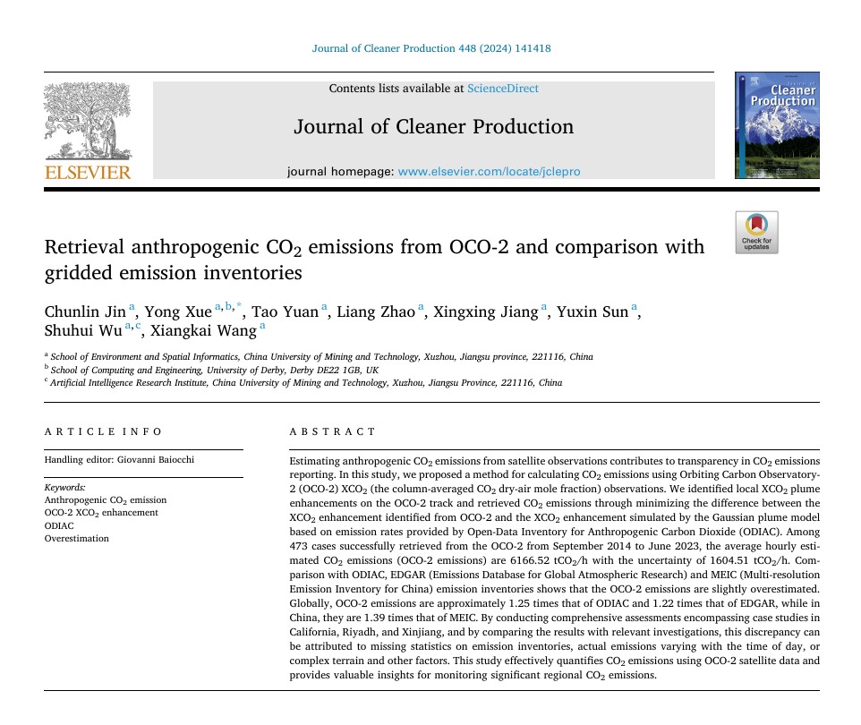 该研究的相关成果以“Retrieval anthropogenic CO2 emissions from OCO-2 and comparison with gridded emission inventories”为题发表在环境科学与生态学领域国际权威期刊《Journal of Cleaner Production》(JCR一区,中科院一区top,IF = 9.7),该期刊影响因子为在环境科学领域国际排名第二十四位(JIF: 24/358)的期刊。IERSD团队博士研究生靳春林为论文的第一作者,国际欧亚科学院院士,国际宇航科学院院士薛勇教授为论文通讯作者,小宝寻花