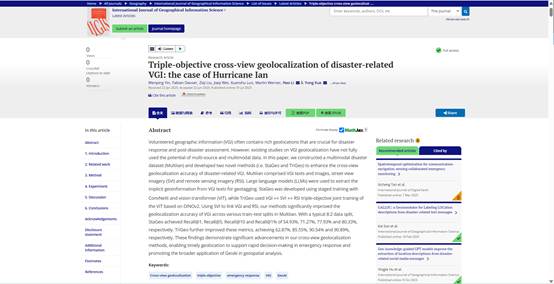近日,团队博士生尹文萍作为第一作者,在中科院一区TOP期刊《International Journal of Geographical Information Science》(IJGIS)发表了一篇灾害场景下跨视角地理定位方法的论文。该研究是在其导师薛勇教授(国际欧亚科学院院士、国际宇航科学院通讯院士)的指导下,联合团队研究生刘子琦以及来自慕尼黑工业大学(TUM)、新加坡国立大学(NUS)和伦敦大学学院(UCL)的学者合作完成的。