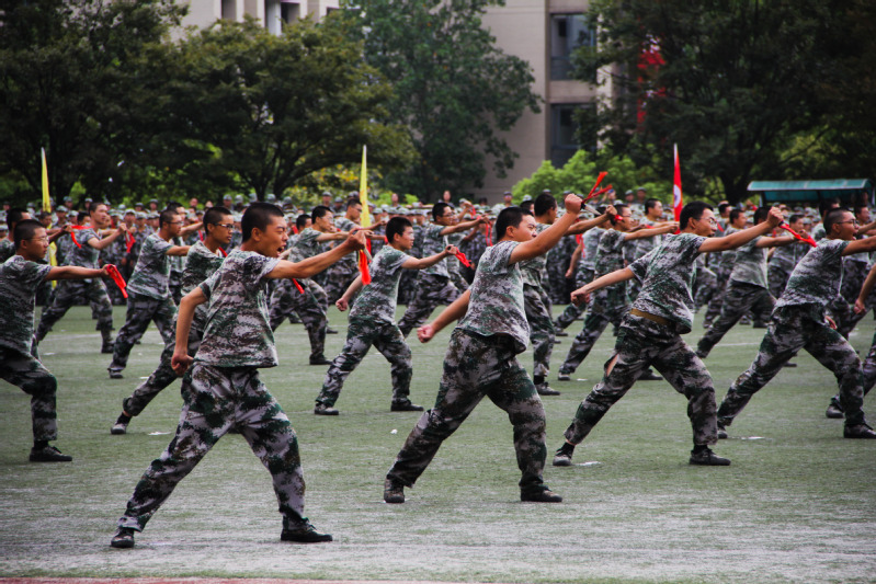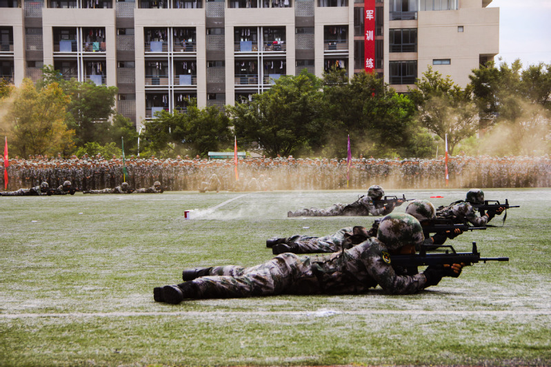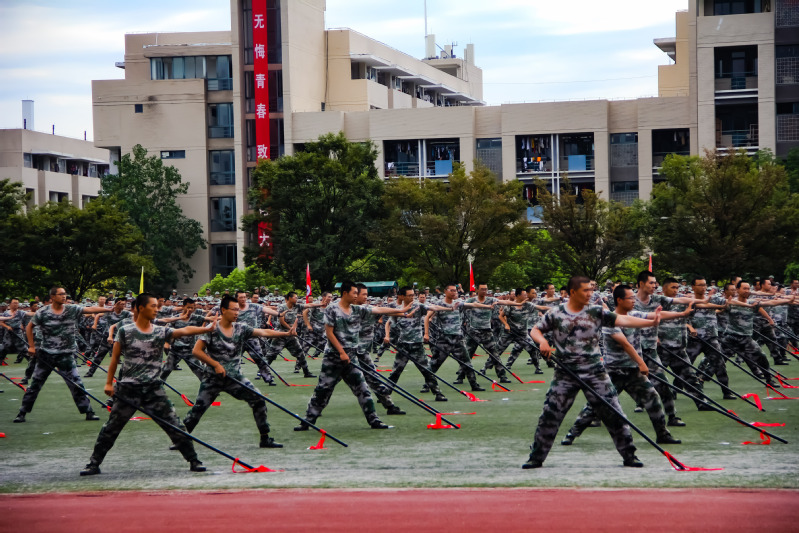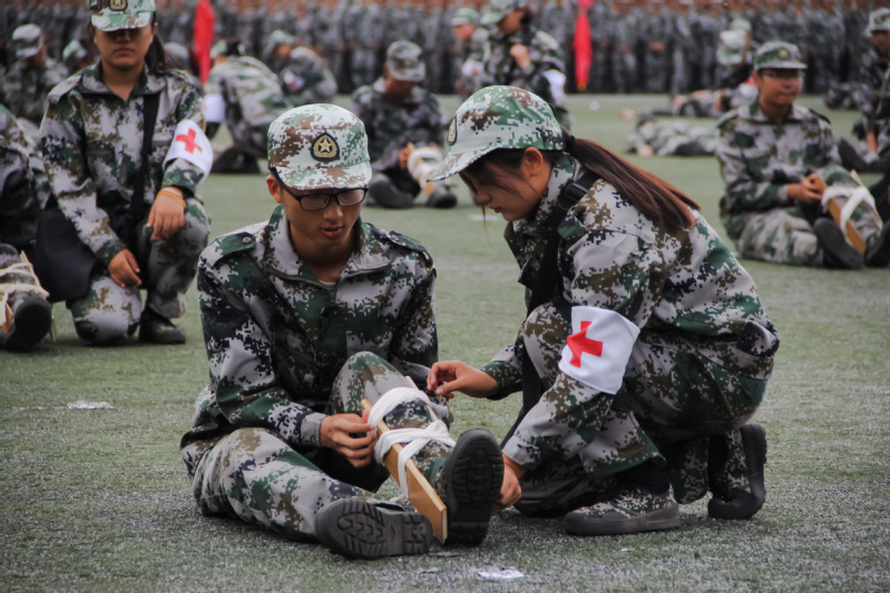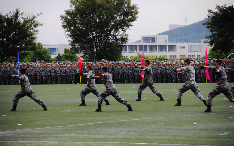 方阵气宇轩昂、昂首阔步、身姿挺拔、落脚坚定,有力的口号声响彻现场,充分展现了环测学子英勇顽强、朝气蓬勃的精神风貌和军训工作的丰硕成果。匕首操、棍术、女子格斗术、医疗队救护等表演也在训练场依次展开。其中,71名环测新生参加了女子格斗术方阵,80名环测新生参加了救护医疗队表演。承训官兵现场展示的擒拿格斗和班战术,更是训练有素、气势磅礴,将整场汇演推向高潮。