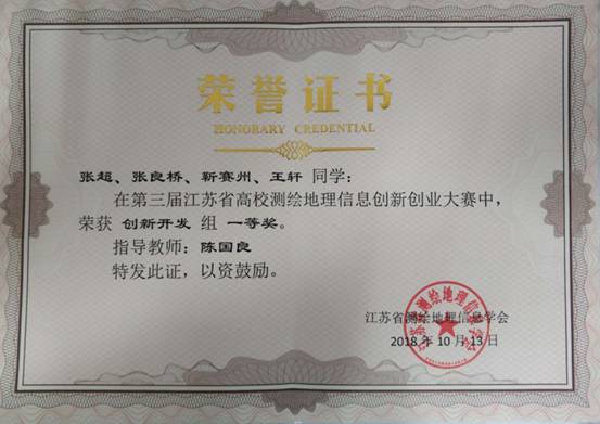 测绘地理信息系高度重视此次比赛,经过前期认真准备、队员多次模拟训练,同时组织张书毕老师、陈国良老师、孙亚琴老师多次指导修改,在此次比赛分别获得研究生创新开发一等奖(张超、张良桥、靳赛州和王轩)和创业优胜奖(束明聪、王睿、司明豪、王俊鹏)。
