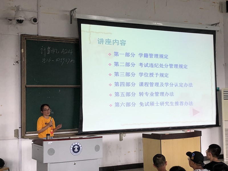 会议伊始,由孙艳梅老师详细讲解学院学籍管理制度,并向新生们详细介绍《学生手册》中的部分内容。她先后解释了教学管理规定、学分制管理规定及素质测评等方面,并介绍了本校有关转专业、免试硕士研究生推荐等内容;为新生较快地了解大学学习及生活模式、制定自身目标做好铺垫。