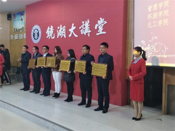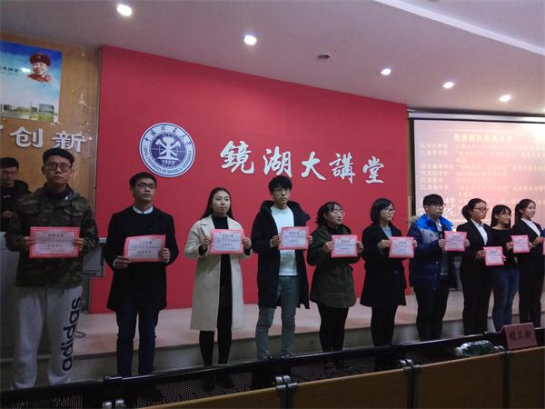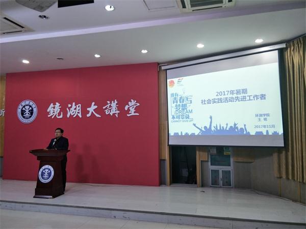 2017年大学生暑期社会实践活动总结表彰大会于12月1日下午在镜湖大讲堂举办。校党委副书记曹德欣、校团委书记陈文、校党委宣传部副部长王传啓、教务部副部长管红杰、学生工作处副处长胡卫新等领导出席本次会议。
