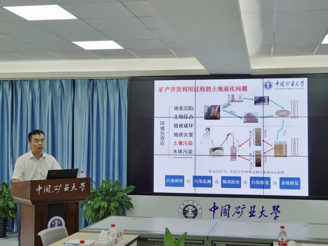 卞正富副校长主持汇报会。江苏省老工业基地资源利用与生态修复协同创新中心雷少刚教授作工作汇报,介绍了协同创新中心、土地生态修复试验场基本情况,并重点汇报了我校在土地修复领域的主要研究成果。