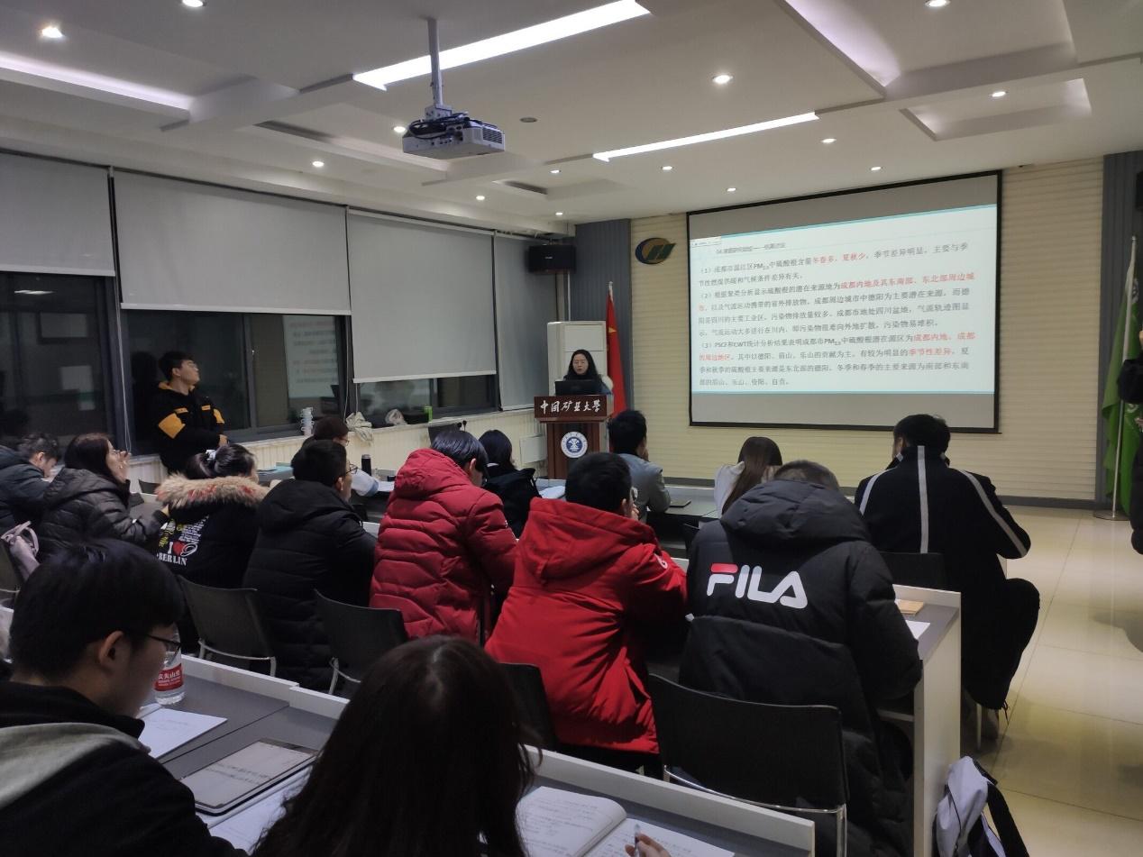 韩旭同学以“降雨对重金属污染沉积物固化和稳定的影响”为题,从研究目的及意义、试验过程以及研究结论三个方面进行汇报与展示;王青青同学以“成都市温江区PM2.5中硫酸根的分布特征研究”为题展开报告,在充分说明了选题背景与意义之后,展示了她的研究思路与方法,通过潜在源贡献分析法和浓度权重分析法得出了研究结果,并进行总结与讨论;刘金香同学以“卷积神经网络(CNN)在高光谱遥感分类领域的研究现状与展望”为题进行报告,分别依次介绍研究背景、发展现状、存在的问题及解决思路,并对此进行了总结与展望;布金伟同学以“GNSS-R遥感海陆应用的最新研究进展以及科研经验分享”为题汇报了GNSS-R遥感海陆应用的最新研究进展、其未来可以做哪些应用,并分享了科研、社会实践和项目的经验。活动同学们认真听取精彩的报告,并进行热烈地讨论。