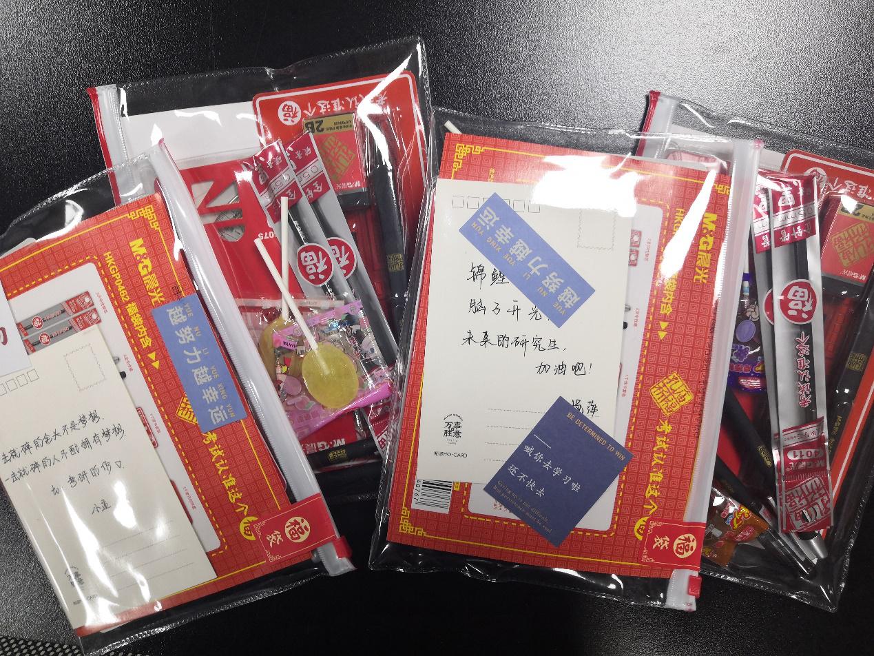 考研礼包里装有祝福卡片、爱心糖果、考场必备文具等。希望考研学子在寒冬题海中积蓄力量,一鼓作气,带着老师和同学们的祝福踏上考场,下笔如神,旗开得胜,一举上岸,收获人生的精彩。