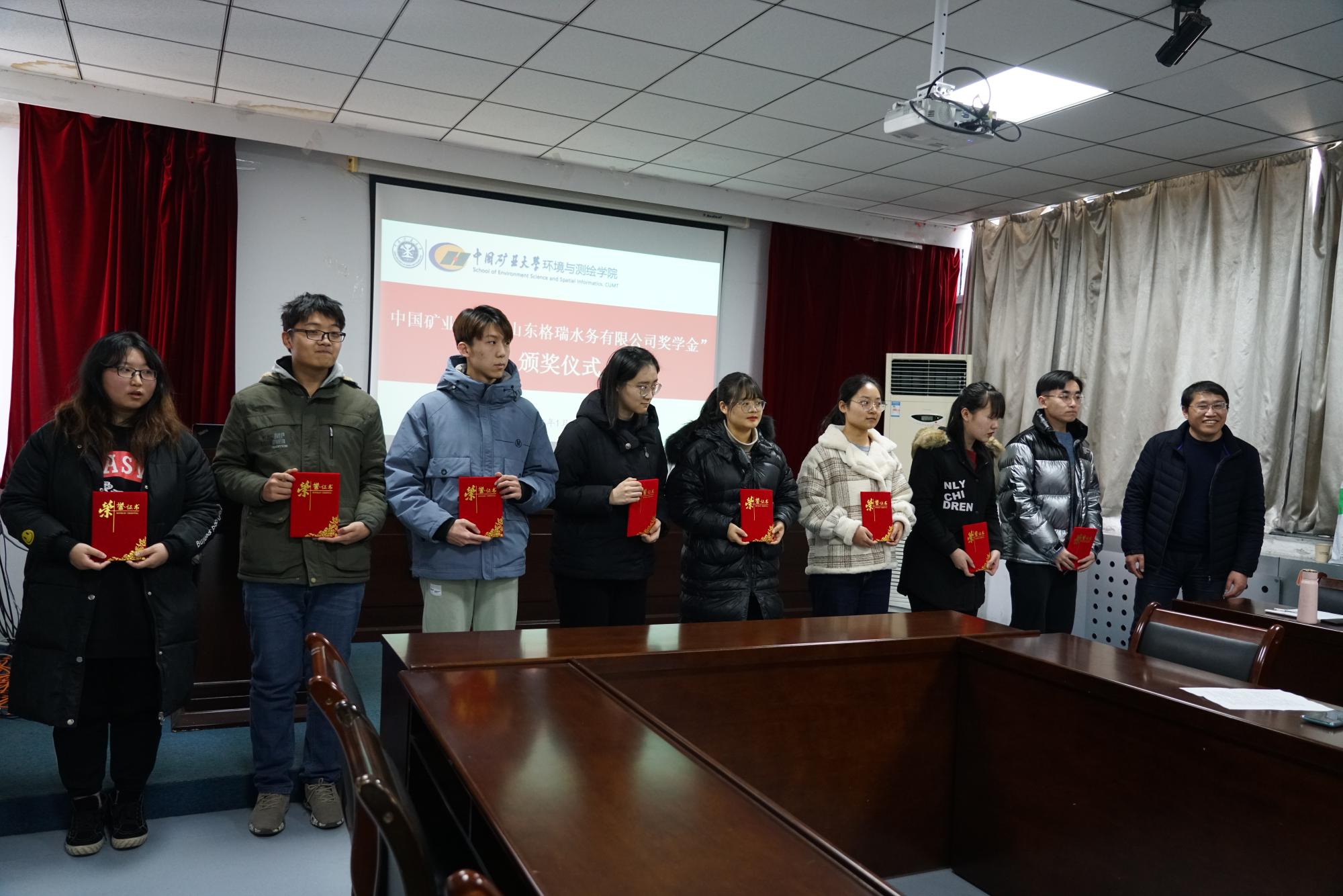 楼C410举行。山东格瑞水务有限公司董事长李新春、副总经理周福远、副总经理夏林、经理常胜,环测教学副院长周来、科研副院长王潜心、党委副书记韩福顺、工会主席刘汉湖、环境科学与工程系主任田立江以及环境专业的教师代表参加出席活动。8名“山东格瑞水务有限公司奖学金”获得者与环境专业学生代表参与颁奖仪式。本次活动由学院团委书记杨琪琪主持。
